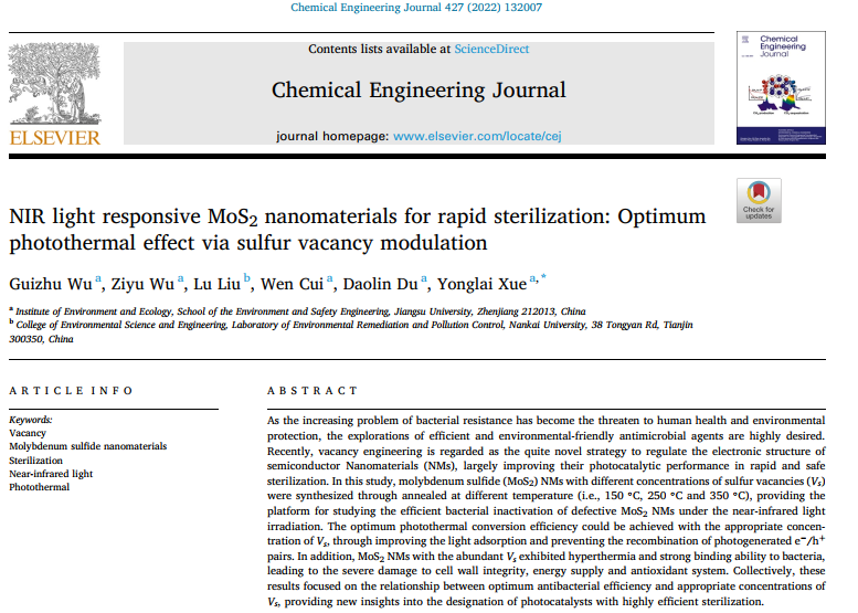 近日,有爱爱 师生的最新研究成果“NIR light responsive MoS2nanomaterials for rapid sterilization: optimum photothermal effect via sulfur vacancy modulation”正式发表于环境领域顶级学术期刊《Chemical Engineering Journal》(IF=13.273,一区)。该论文为有爱爱 与南开大学合作完成,有爱爱 为该论文的第一完成单位及通讯单位,青年教师吴桂竹为论文的第一作者。