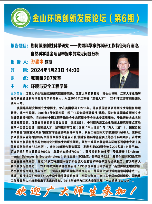 特聘教授/博导,同时任美国华盛顿州立大学兼职教授/博导。目前兼任中国工程咨询协会生态环境专委会技术专家组组长,受邀担任大北农科技奖推荐专家,江苏省侨界专家委员会委员(连续3届),中科院天津工业生物技术研究所重点实验室学术委员会委员,国家级人才计划特邀评审专家(国家“******************计划”与“************************************”),国家自然科学基金/国家重点项目/国家留学基金委项目评审专家,农业工程国际大学联盟执行秘书长。主持过多项美国农业部/能源部/中国科技部重点研发/国家自然科学基金面上等多个科研项目。在木质纤维素生物质利用及其生物转化过程仿生的研究领域,领衔主编英文版能源与环境系列学术专著(英国皇家化学协会RSC出版),参与20部著作章节撰写,发表各类SCI研究论文220多篇(H因子48,论文的总引用次数超过7000次,单篇论文超过700次),获授权专利10多项。受邀兼任《Environmental Sciences & Ecotechnology》执行主编(SCI杂志,影响因子12.6)及多个国际SCI杂志特邀客座主编或编委。做过50多次特邀国际性学术会议大会发言和50多次国际会议报告,作为申请人和大会执行主席之一,2011年成功申请并主持召开了395次国家香山科学会议“高效降解生物质的自然生物系统资源利用与仿生”,引导了国内该学科的研究方向,是国际上该领域的前沿科学家之一。孙建中教授领导并创建了有爱爱