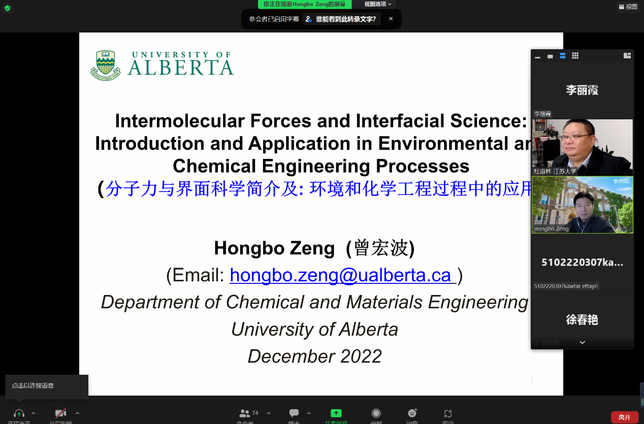 12月15日,阿尔伯塔大学化学工程和材料工程系终身教授、加拿大工程院院士、国家讲席教授、加拿大皇家科学院青年院士曾宏波受邀为院师生做题为“分子力与界面科学简介及在环境和化学工程过程中的应用”讲座。有爱爱
