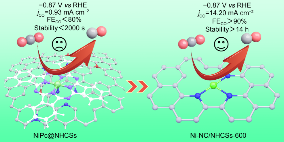 前期,通过分子催化剂催化位点可控的优化,成功优化钴基多相分子催化剂的活性和稳定性(nano energy, 84, 2021, 105904)和(Adv. Funct. Mater. 2022, 2110649)。但研究发现异质化的镍酞菁(NiPc)多相分子催化剂的电催化稳定性很差(单一产物选择性<80%,稳定测试<2000 s)。吕晓萌、吴春笃研究团队发现,通过高温碳化的策略来稳定分子中心Ni催化单元,可以有效改善异质化的NiPc多相分子催化剂的电催化CO2还原的稳定性,实现对单一产物CO的最大选择性为98.57%, 稳定测试14 h。研究团队针对稳定性机理及温度对构效关系的影响规律进行了细致的讨论,总结了相关基础理论。该稳定性机理成功用于指导在不同碳基底上设计稳定的Ni催化单元,构建多类型稳定、高活性的催化剂。该研究团队还结合燃料电池技术和可充放电电池技术,设计了锌-CO2可充放电电池,该电池显示出0.64 mW cm−2的峰功率密度和91.45%的CO法拉第效率。这项研究成果为CO2资源化装置及催化剂的研发拓宽了道路。