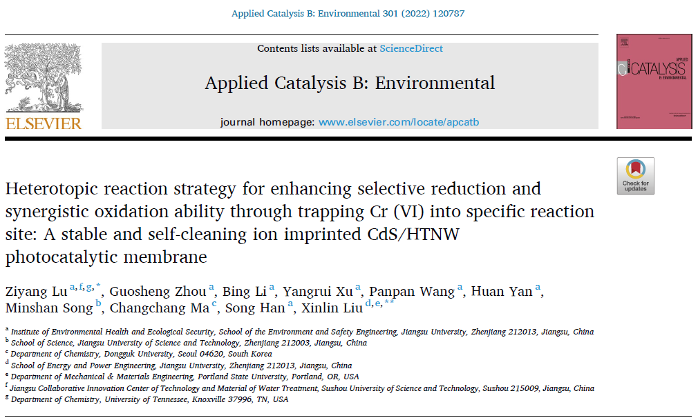 逯子扬副研究员在环境领域顶级学术期刊Applied Catalysis B: Environmental(影响因子:19.503,一区,Top期刊)上在线发表题为 “Heterotopic reaction strategy for enhancing selective reduction and synergistic oxidation ability through trapping Cr (VI) into specific reaction site: A stable and self-cleaning ion imprinted CdS/HTNW photocatalytic membrane”的研究论文。有爱爱