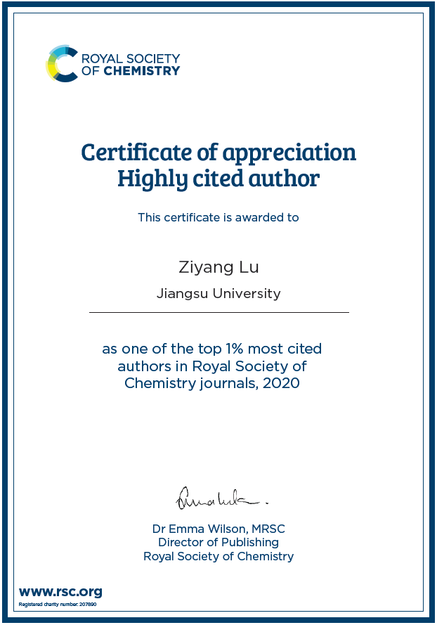 英国皇家化学会于1841年成立于伦敦,在国际学术交流、主办期刊、会议、科学研究、教育以及向公众传播科学知识等领域享有盛誉。英国皇家化学会出版的期刊多数被SCI收录,是学术研究的重要信息来源。为彰显作者对研究领域的突出贡献,英国皇家化学会对旗下四十多本期刊发表论文的引用情况进行统计,将2018、2019年发表的论文在2020年的被引次数在全球排名前1%的名单进行了筛选,这也是有爱爱