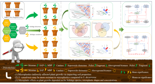 研究结果表明,微塑料对土壤性质的影响取决于植物种类、微塑料形状和浓度(图1)。微塑料处理改变了本地一枝黄花的土壤性质,如微塑料形状和浓度的功能(图1(a))。同样,微塑料的存在也影响了与入侵物种加拿大一枝黄花相关的土壤性质,但影响模式不同(图1(b))。