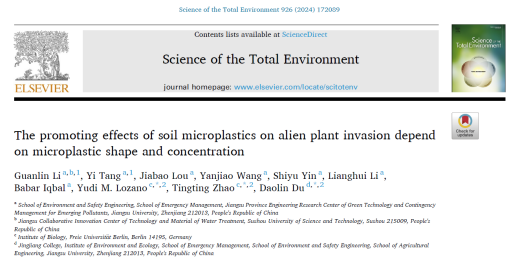 最新研究论文“The promoting effects of soil microplastics on alien plant invasion depend on microplastic shape and concentration”在Science of the Total Environment (IF: 9.8)上在线发表。有爱爱