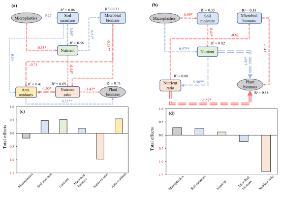 图3 微塑性对土壤性质和植物生长影响的偏最小二乘路径模型(PLS-PM),以及各因素的标准化总效应结果。(a)本地物种微塑料的PLS-PM通径分析;(b)微塑料对入侵物种的PLS-PM通径分析;(c)微塑料对本地物种的总影响;(d)微塑料对入侵物种的总影响。