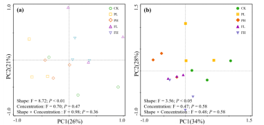 图1微塑料对本地物种(a)和入侵物种(b)土壤性质影响的主成分分析(PCA)。