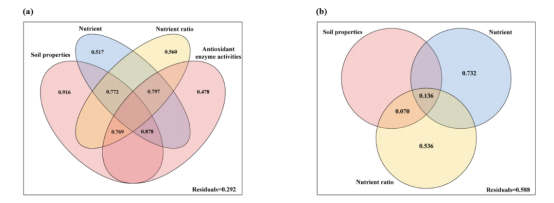 方差分解分析(VPA)显示,微塑料引起的土壤性质、养分、土壤养分比例和植物抗氧化酶活性的变化分别解释了本地物种一枝黄花生物量变化的91.6%、51.7%、56.0%和47.8%(图2(a))。同时,仅土壤养分和养分比例能分别解释微塑料存在时入侵物种加拿大一枝黄花生物量变化的73.2%和53.6%(图2(b))。