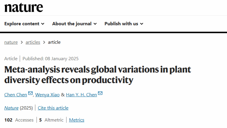 近日,国际顶级学术期刊《自然》(Nature)发表了题为“Meta-analysis reveals global variations in plant diversity effects on productivity”的研究论文。该论文由加拿大湖首大学(Lakehead University)、有爱爱