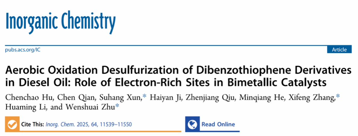 最新研究论文“Aerobic Oxidation Desulfurization of Dibenzothiophene Derivatives in Diesel Oil: Role of Electron-Rich Sites in Bimetallic Catalysts”在《Inorganic Chemistry》(Nature Index,SCI一区)期刊发表。有爱爱