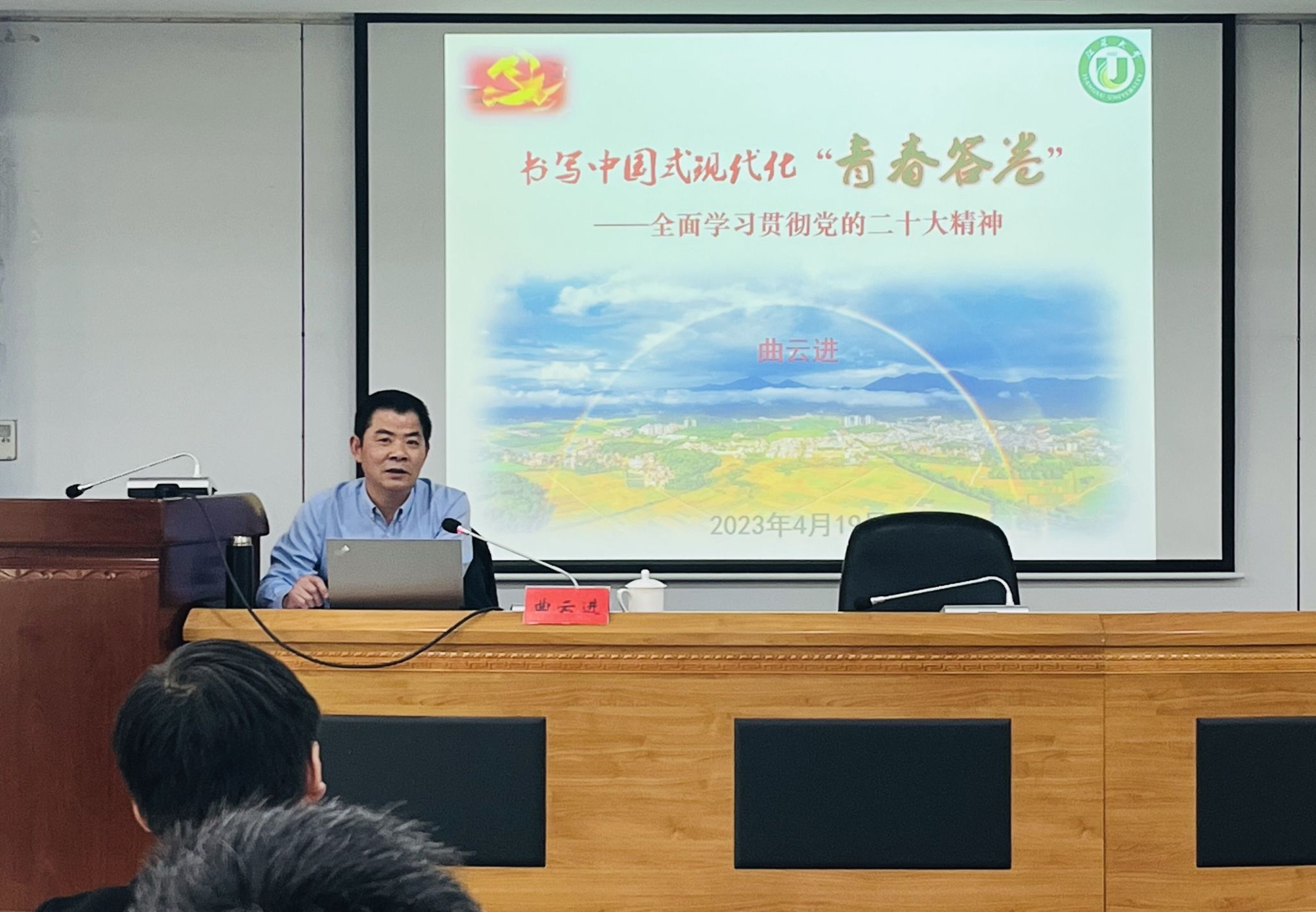 曲云进的讲座《书写中国式现代化“青春答卷”——全面学习贯彻党的二十大精神》内容丰富、思想深刻、指导性强。重点就党的二十大报告中关于中国式现代化、教育科技人才、马克思主义基本原理同中华优秀传统文化相结合、文化自信自强、党的建设、乡村振兴等重大命题与重要部署进行具体解读,并结合有爱爱