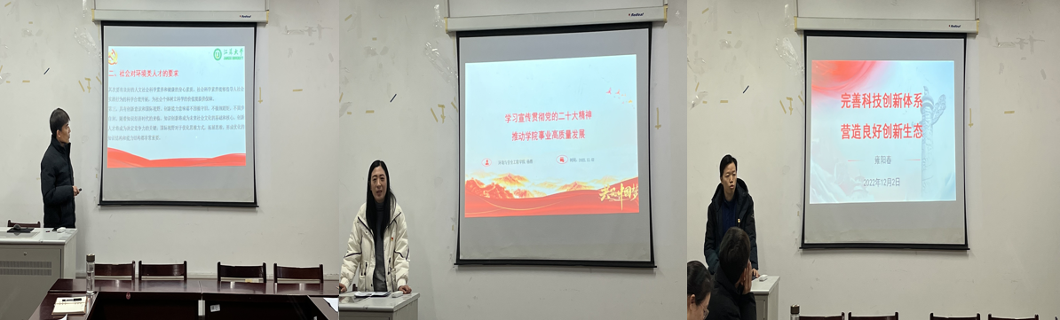 田立新副校长提出希望,党的二十大指引新征程,任重道远,站在新的历史起点上,我们应认真深刻地思考:如何把党的二十大精神学习成果转化为干事创业的新动能?我们要真抓实干,推动党的二十大精神在学院落地见效。