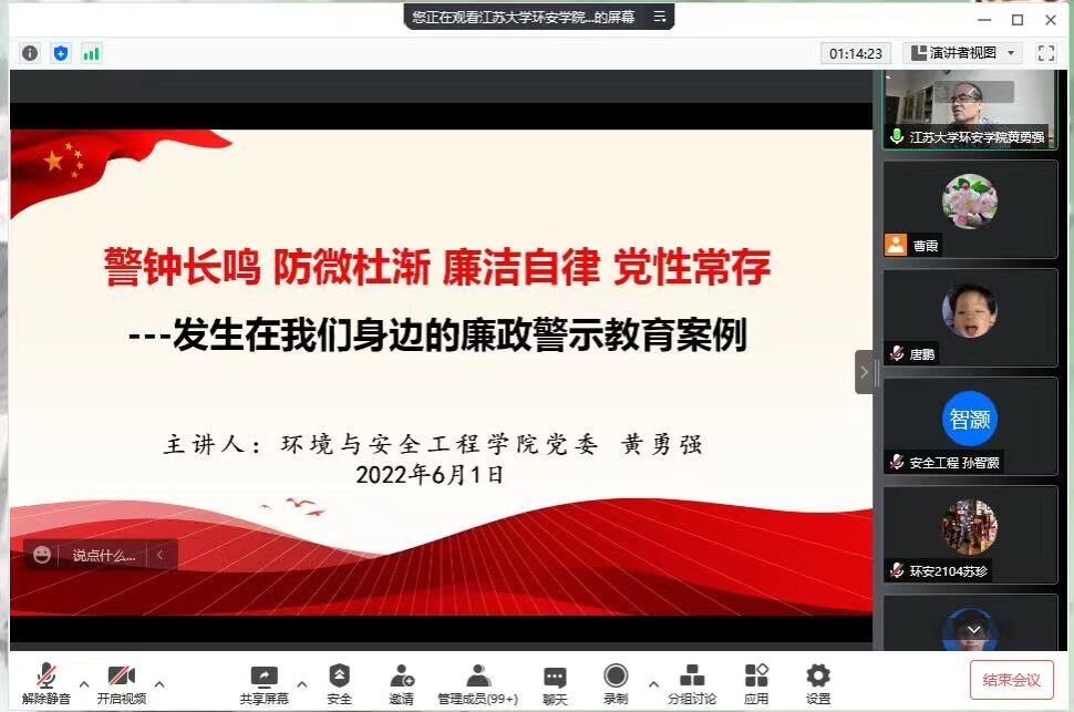 6月1日,学院党委组织学院全体师生党员和入党积极分子参加了线上党风廉政建设教育讲座。党委书记黄勇强以“警钟长鸣 防微杜渐 廉洁自律 党性长存”为题,列举了大量发生在我们身边的违法违纪案例,为党员们敲响了警钟,打了廉洁自律的预防针。
