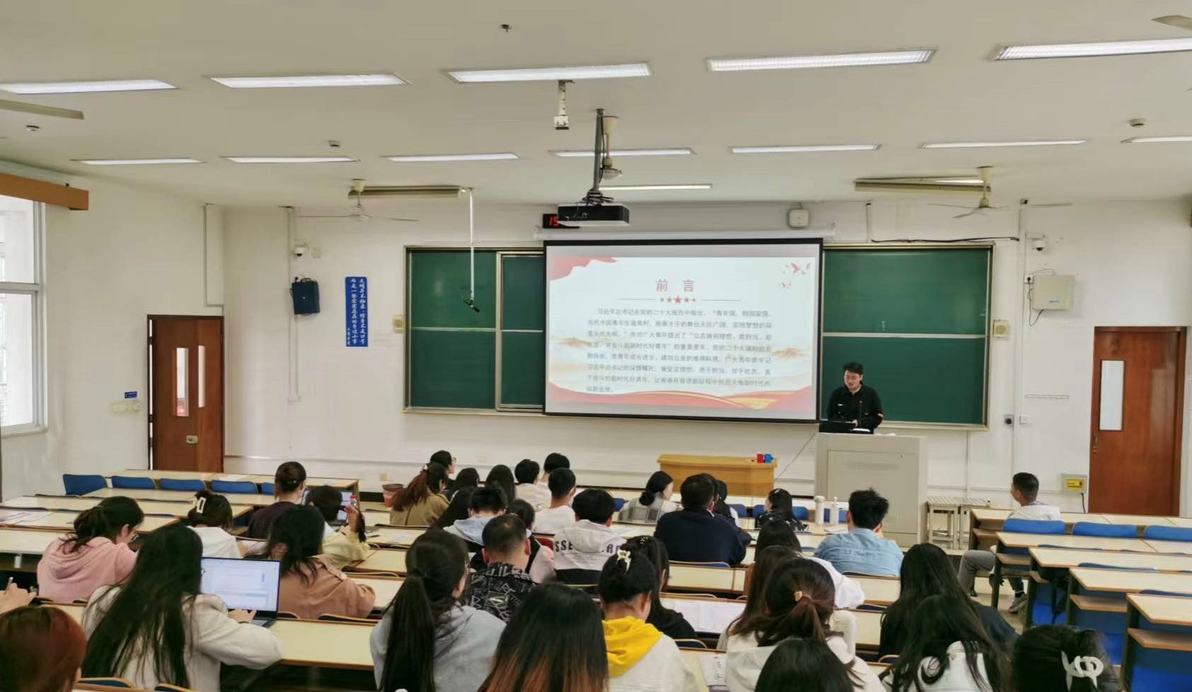 21级研究生党支部党员李艳、吕治邦,在讲堂群302给学院全体学生党员上党课。本科生支部书记、研究生辅导员李同庆主持。